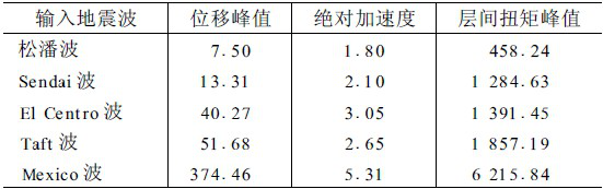 在不同地震波作用下,隔震结构会有不同地震反应。以上述结构为例,笔者计算了该隔震结构在不同地震波作用下的反应时程。为使对比明显,在计算中只对y方向输入单向地震波。计算用的地震波包括EICentro N-S波、Taft E-W波、Sendai N-S波、Mexico E-W波以及松潘波,地震波的峰值均被调整为350gal。